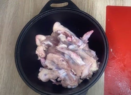 - Спинки, шея, крылышки, головы и лапки от домашней курочки лучше оставить для варки бульона. К ним можете присоединить потроха.