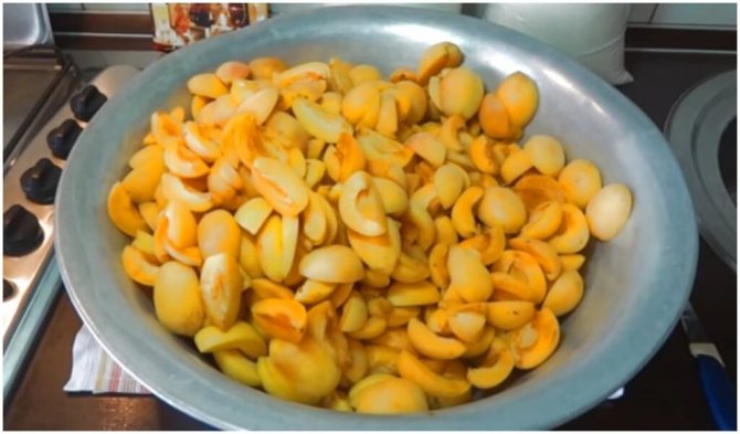 - Абрикосы вымываются и очищаются от косточек. Их необходимо порезать на 2-3 части, чтобы были довольно-таки крупные кусочки, тогда они не развалятся в процессе варки.