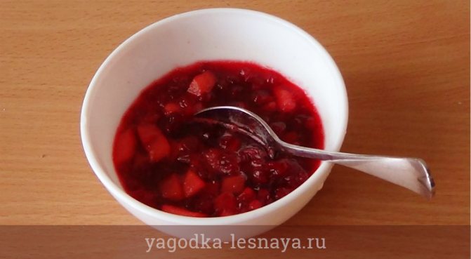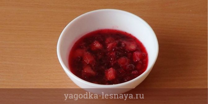 - Яблоки очистить от семенной коробочки и нарезать кусочками среднего размера. Добавить к ним бруснику (брать только целы хорошие ягоды).