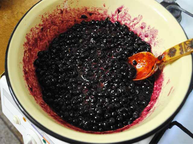Чем меньше размешивать варенье, тем целее будет черника, меньше сока потеряет. Но это не значит, что ягоды сверху должны оставаться сухими. Во время нагрева можно их слегка опускать лопаткой или поливать сиропом с помощью ложки.