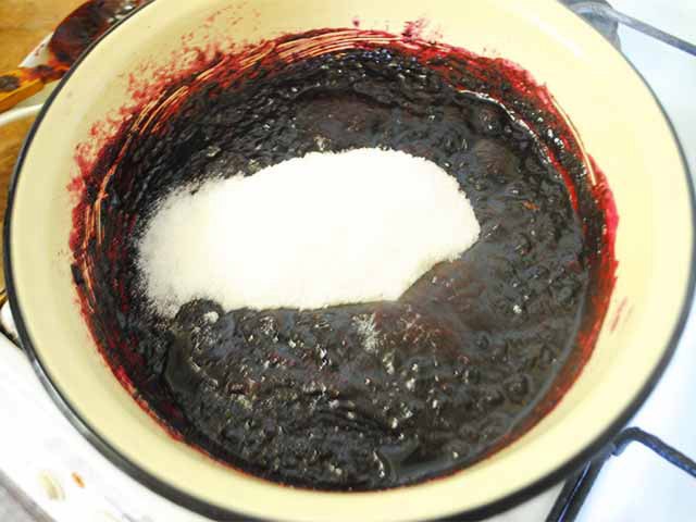- Высыпать промытую чернику в миску, добавить 1,5 кг сахара и хорошо помять или перемолоть блендером. Можно сначала пропустить сырье через мясорубку, затем соединить с сахаром.