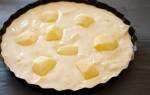 - Форму для выпечки застелить пергаментом, смазать маслом без запаха, выложить яблочные дольки. Залить жидким тестом.