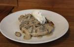 - На каждый стейк выкладываем по ложке сметаны, вливаем в сотейник полстакана воды, закрываем крышкой и тушим 15-20 минут. Можно тушить не на плите, а в плите, т.е. в духовке. Как вам удобно будет!